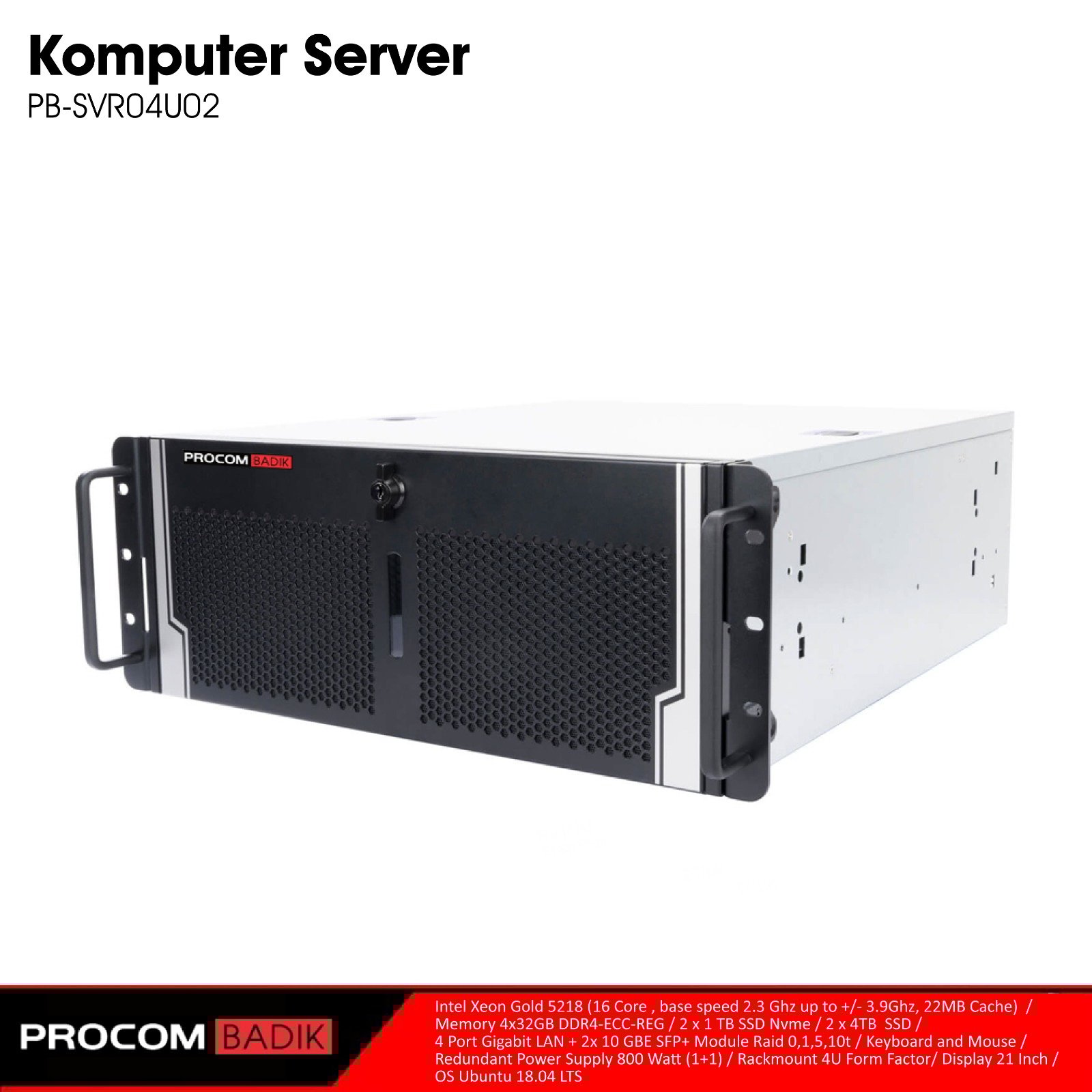Intel Xeon Gold 5218 (16 Core , base speed 2.3 Ghz up to +/- 3.9Ghz, 22MB Cache) / Memory 4x32GB DDR4-ECC-REG / 2 x 1 TB SSD Nvme / 2 x 4TB SSD / 4 Port Gigabit LAN + 2 x 10 GBE SFP+ Module Raid 0,1,5,10t / Keyboard and Mouse / Redundant Power Supply 800 Watt (1+1) / Rackmount 4U Form Factor/ Display 21 Inch/OS Ubuntu 18.04 LTS